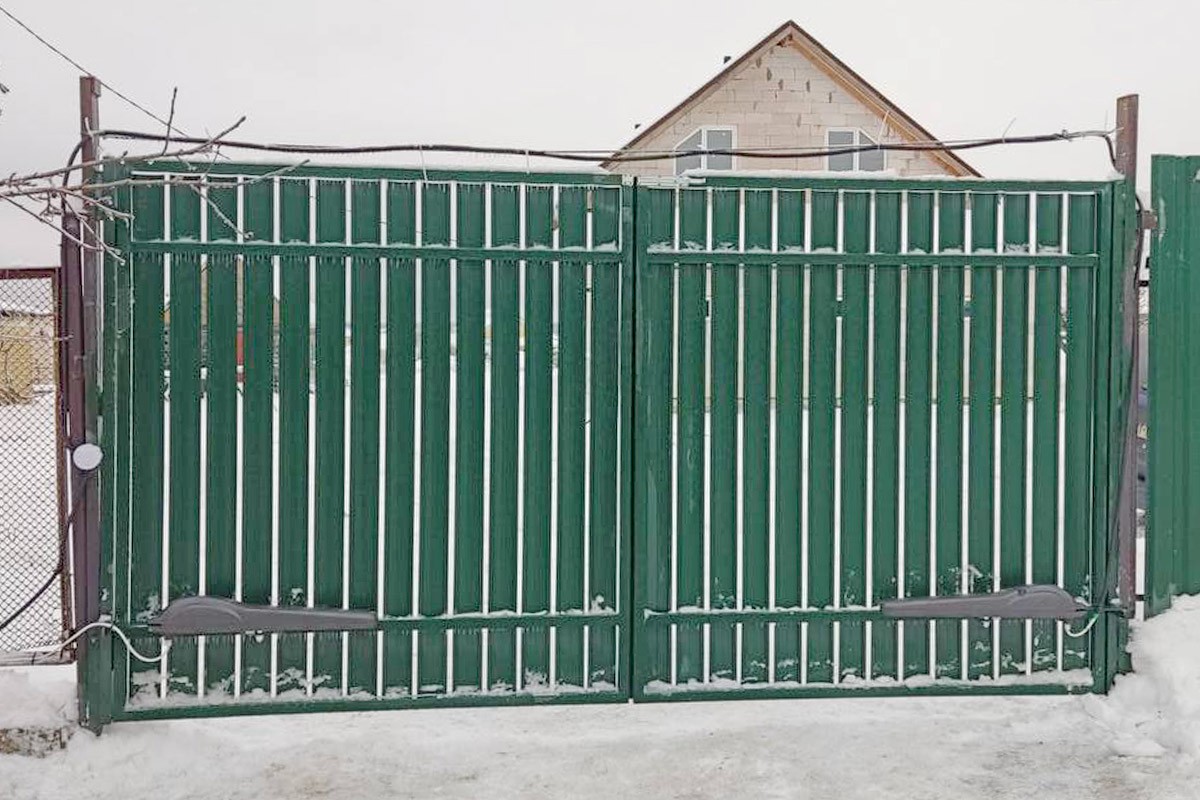 - Распашные ворота 4 метра с автоматикой, две створки. Заполнение — евроштакетник (6005 глянец)