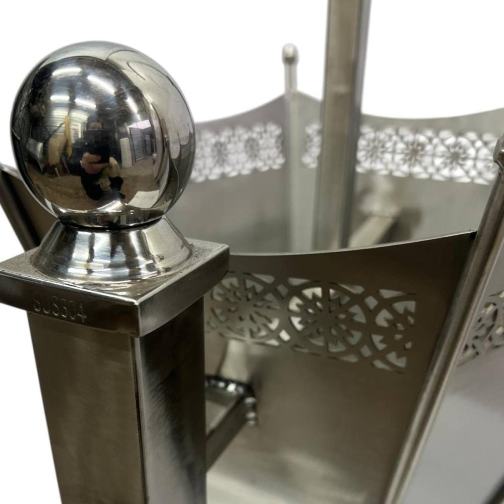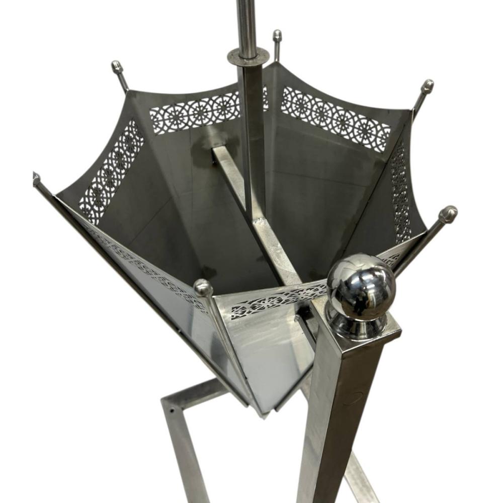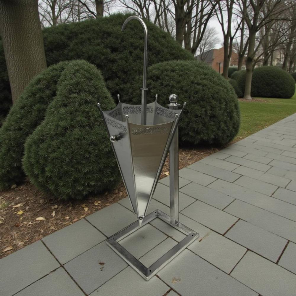 Каркас уличной урны выполнен из профильной нержавеющей трубы нескольких сечений (40×40 мм, 40×20 мм и 20×20 мм), что обеспечивает прочность и устойчивость конструкции при минимальном весе. Каркас бака стилизован под зонт и изготовлен из листовой нержавеющей стали; все элементы и декоративный узор вырезаны на лазерном станке, что даёт ровные кромки и аккуратный внешний вид.